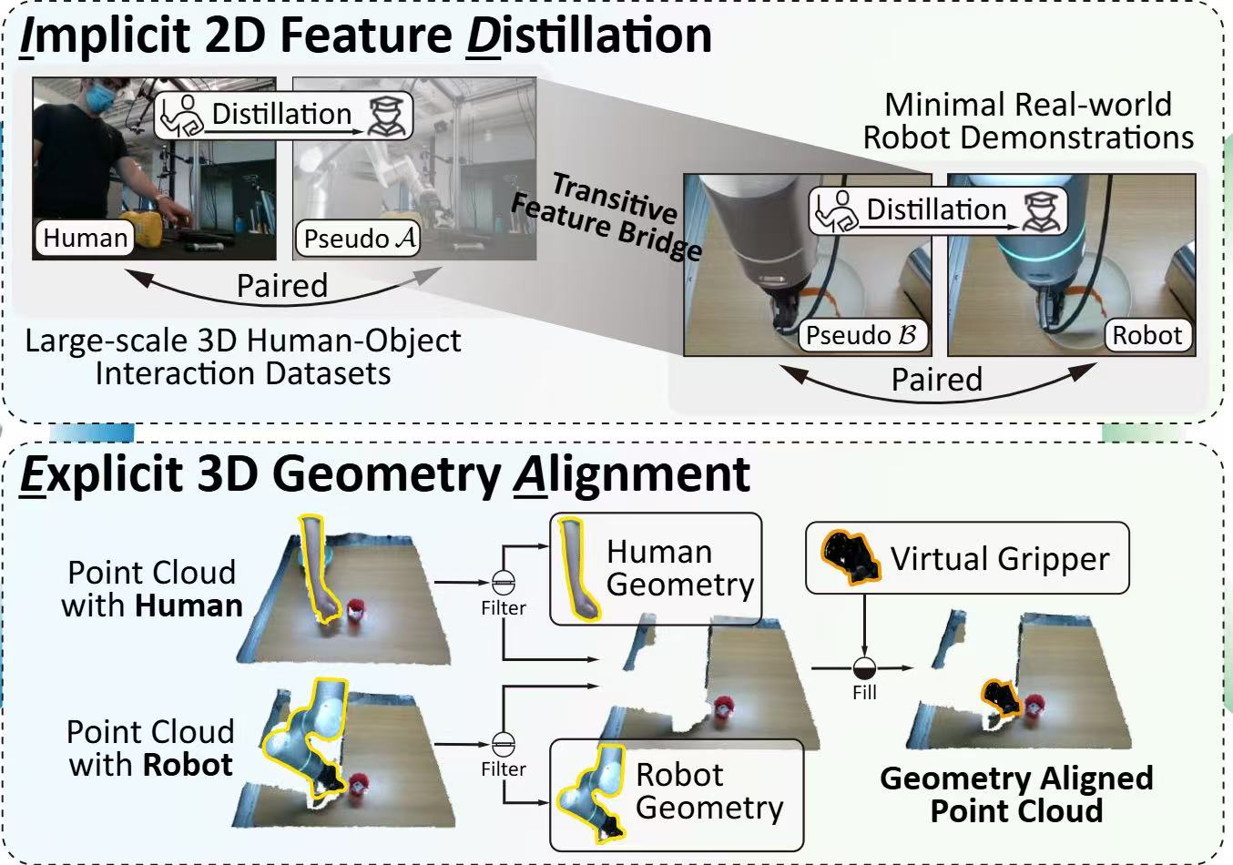 LIDEA: Human-to-Robot Imitation Learning via Implicit Feature Distillation and Explicit Geometry Alignment